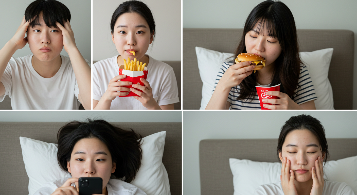 - 잘못된 식습관: 햄버거, 피자, 라면, 초콜릿... 맛있지만 피부에는 최악! 이런 음식들은 혈당을 빠르게 높여(GI 지수가 높음) 인슐린 분비를 촉진하고, 결국 피지선을 자극해 여드름을 악화시켜요.