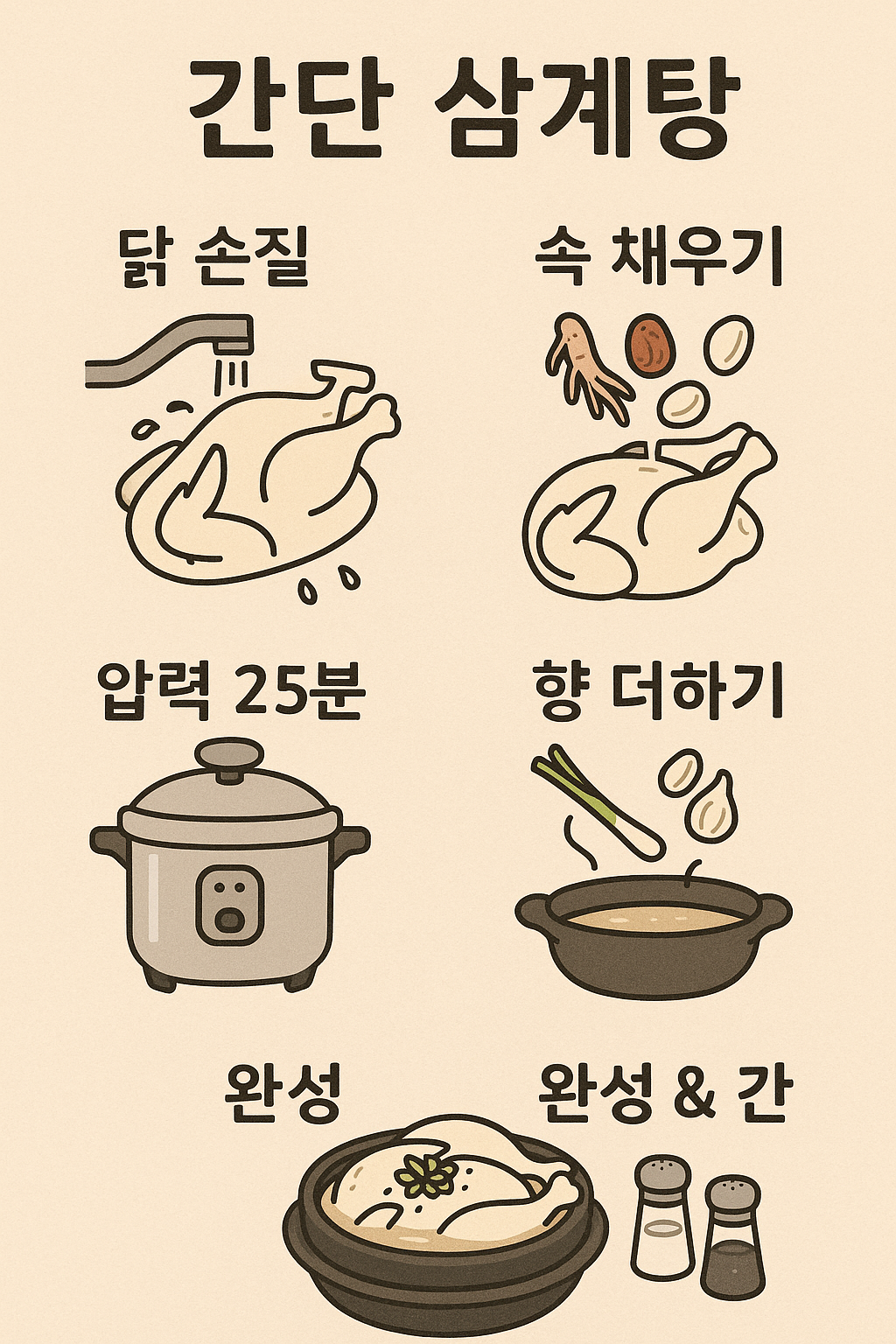 오늘은 압력솥을 활용한 초간단 삼계탕 레시피를 알아봤습니다. 복날이라고 해서 꼭 오랜 시간 공들일 필요는 없습니다. 짧은 시간과 최소한의 재료로도 충분히 깊고 진한 보양식을 만들 수 있습니다.