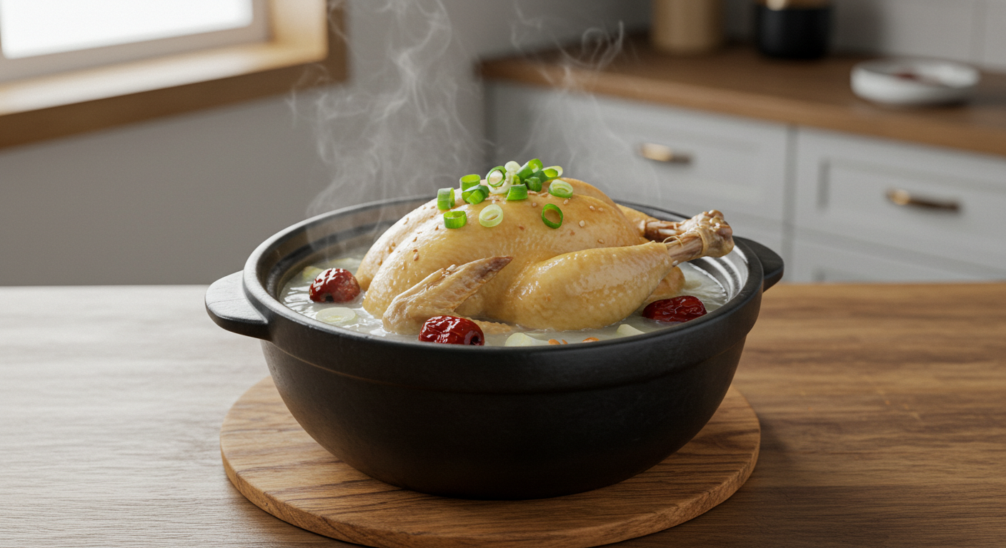 - 간 맞추기 & 플레이팅 🥢: 소금, 후추로 간을 맞추고, 국물을 닭 위에 끼얹어 윤기를 낸 후 따뜻한 뚝배기에 옮겨 담아 즉시 상에 올립니다.