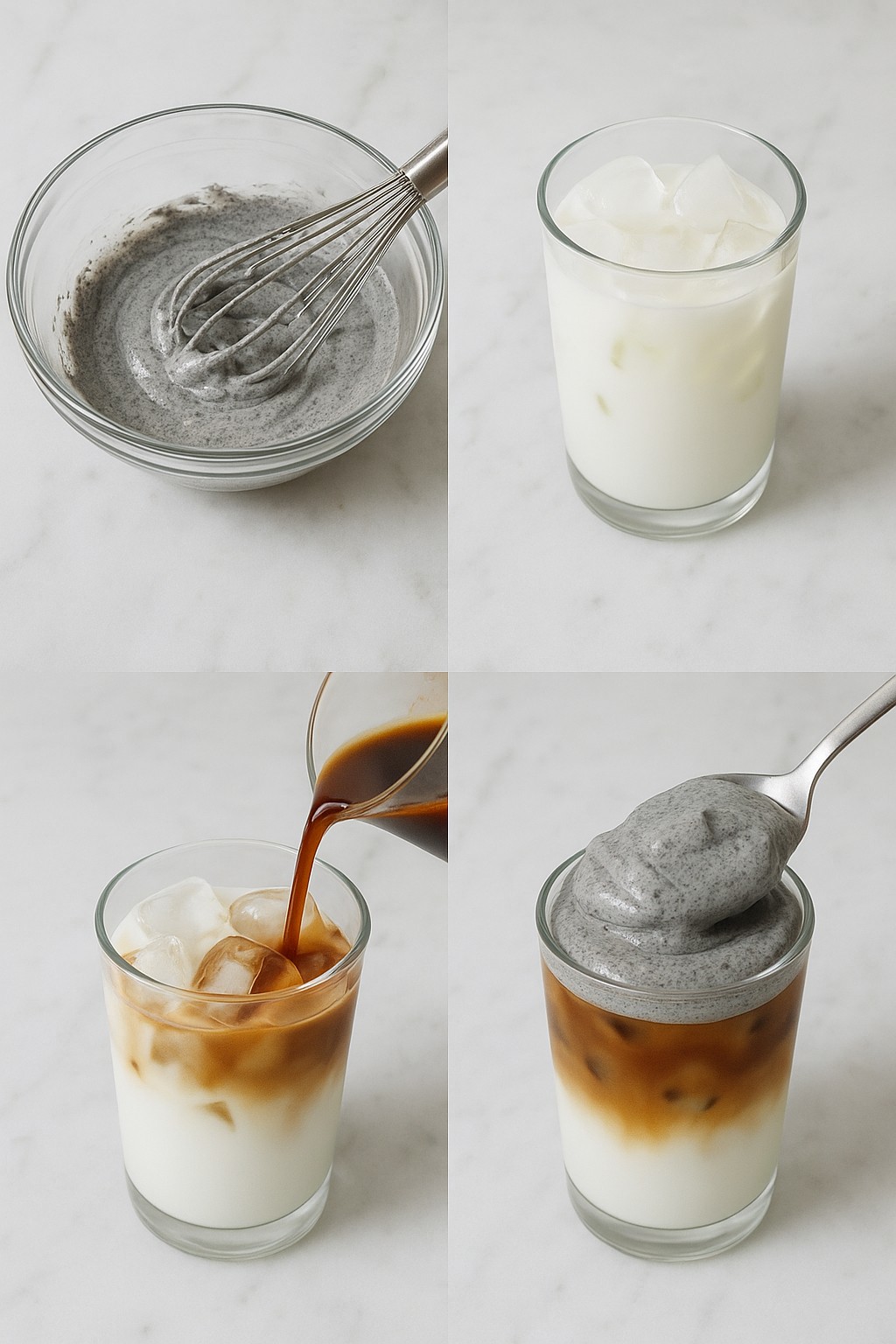 - 마무리 토핑: 마지막으로 미리 만들어둔 흑임자 크림을 듬뿍 올려주세요. 숟가락으로 크림을 살살 얹으면 예쁜 비주얼이 완성됩니다!