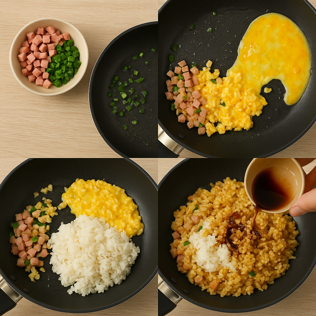 - 밥 넣고 볶기: 계란이 70% 정도 익으면 찬밥을 넣고 밥알이 뭉치지 않게 볶아주세요.