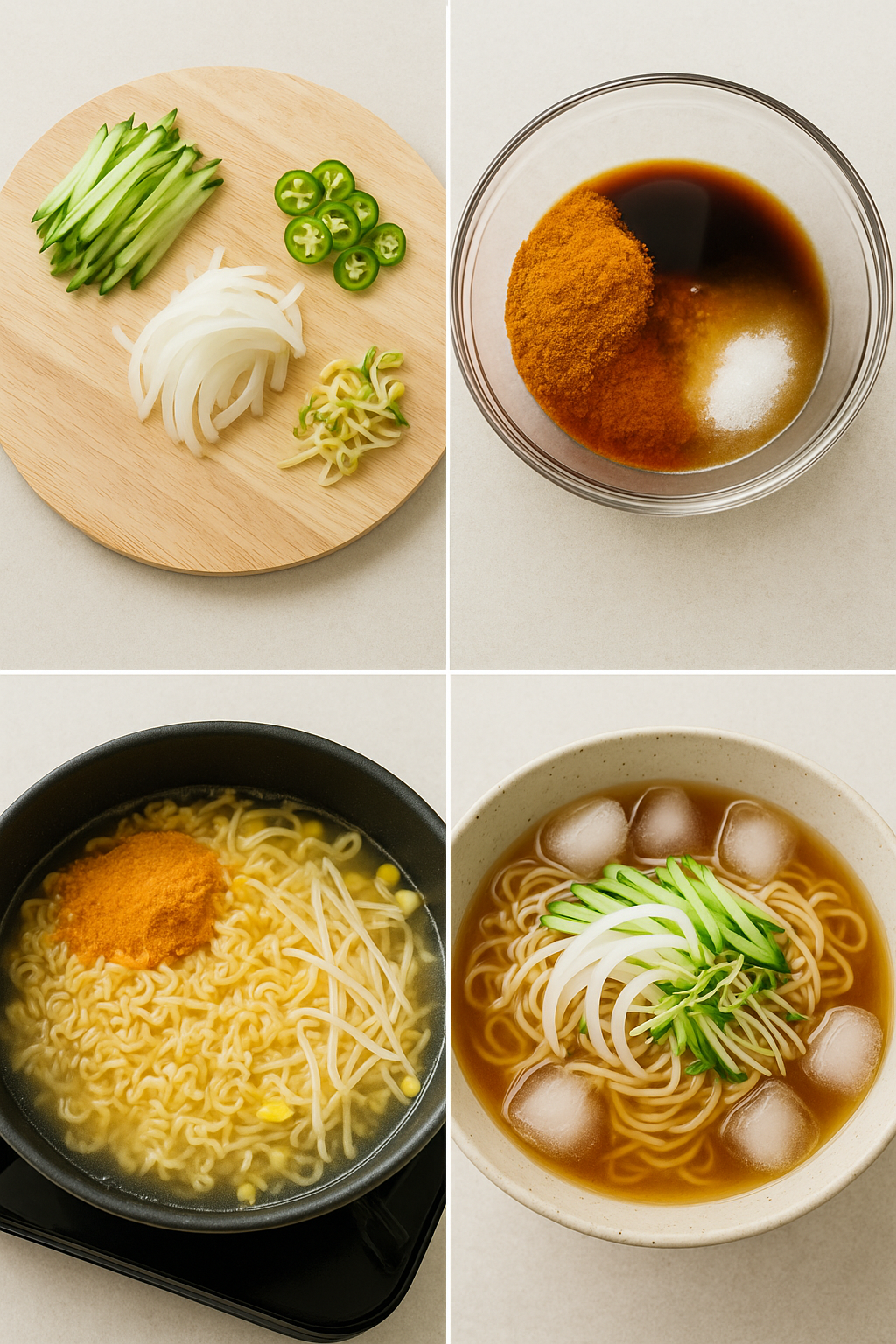 - 플레이팅: 그릇에 면을 담고, 차갑게 식힌 육수를 부은 후, 준비한 고명과 얼음을 올리면 완성!