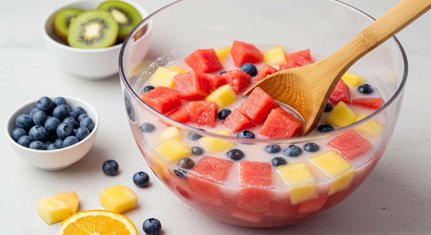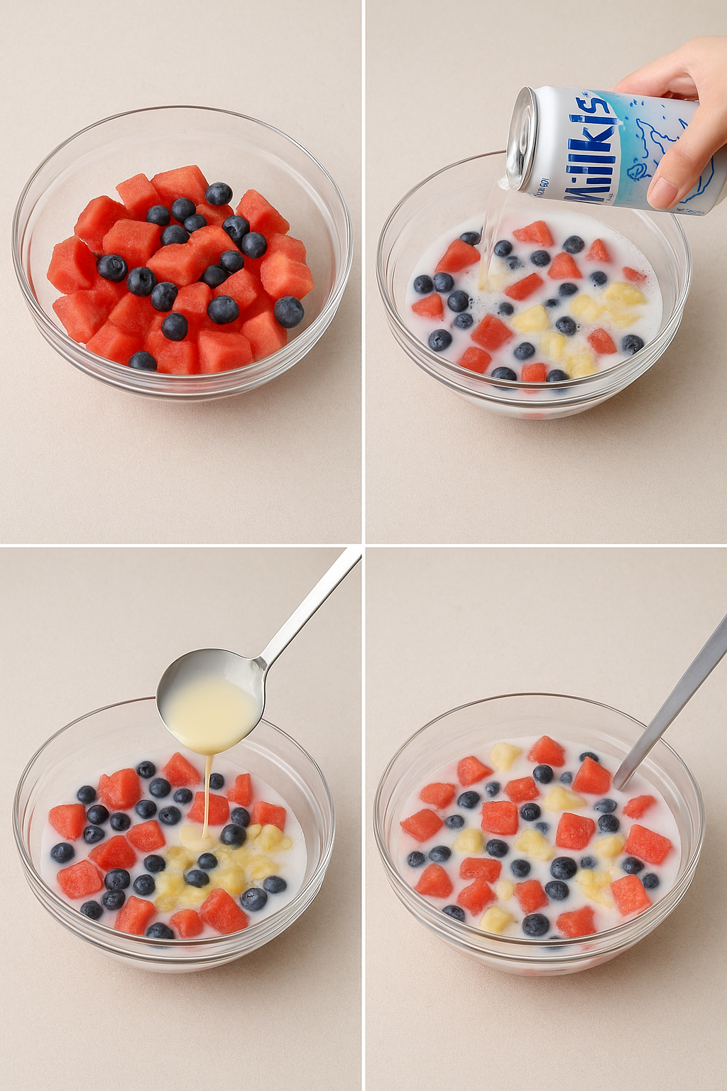 - 1. 과일 준비: 수박은 먹기 좋은 크기로 깍둑썰기하고, 블루베리, 미니 파인코코(건더기만)를 준비해 큰 볼에 담아주세요.