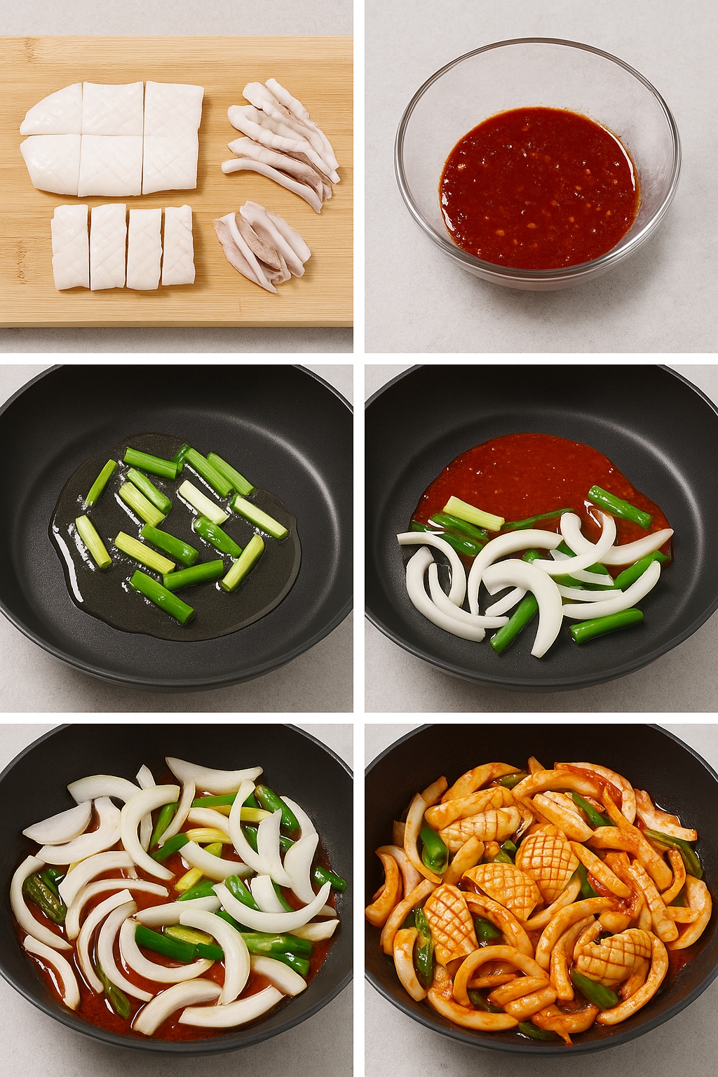 오징어 몸통에 사선으로 칼집을 내면 양념이 더 잘 배어들고, 익었을 때 꽃처럼 벌어져 보기도 좋고 식감도 좋아요. 또한, 팬에 대파를 먼저 볶아 향을 내는 '파기름'은 볶음 요리의 풍미를 한층 끌어올리는 마법 같은 역할을 하니 꼭 활용해 보세요!