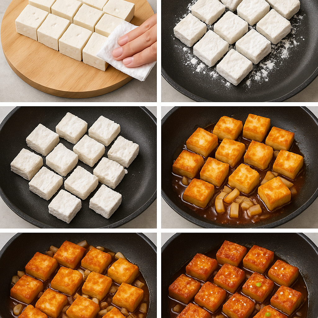 - 양념 넣고 조리기: 두부가 노릇하게 구워지면 만들어 둔 양념장을 팬에 부어주세요. 이때 양파 같은 채소를 함께 넣고 볶아주면 더욱 맛있습니다.